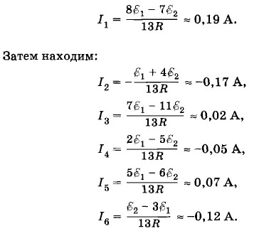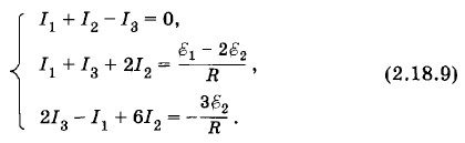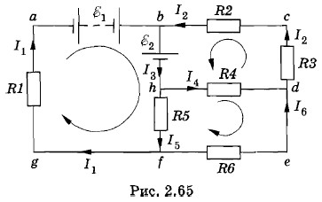 Глава 2. Постоянный электрический ток § 2.18. Примеры решения задач (окончание)Задача 6Найдите силы токов в каждой ветви электрической цепи, схема которой показана на рисунке 2.65. Решение. Зададим произвольно направления токов (см. рис. 2.65). Применим первое правило Кирхгофа для узлов b, h и f (для упрощения записей модули сил токов обозначим буквами I1, I2, I3 и т. д.):