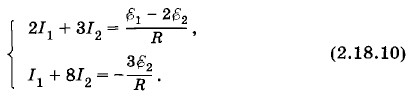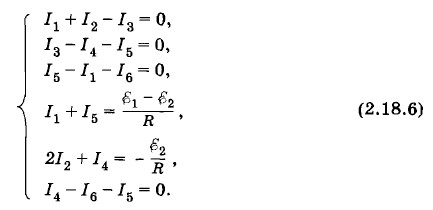 Решение такой системы уравнений требует терпения и внимательности. Решим эту систему последовательным исключением неизвестных величин. Из последнего уравнения системы (2.18.6) находим I5 = I3 - I4. Подставив значение I5 в третье уравнение, получим систему: