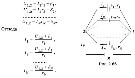Отрицательные значения сил токов I2, I4 и I6 означают, что при данных значениях ЭДС и сопротивлений эти токи имеют направления, противоположные указанным на рисунке. Задача 7Батарея состоит из N параллельно соединенных источников тока (рис. 2.66). Определите ЭДС и внутреннее сопротивление источника тока, эквивалентного этой батарее. Решение. Обозначим ЭДС параллельно соединенных источников через Применив закон Ома (2.15.3) для участка цепи, содержащего ЭДС, для каждой ветви (см. рис. 2.66), получим: