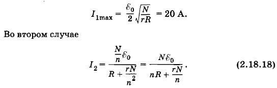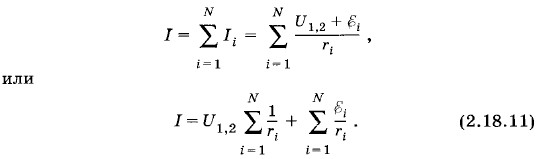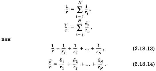 Таким образом, при параллельном соединении нескольких источников тока полученную батарею можно заменить эквивалентным источником тока, ЭДС которого ε и внутреннее сопротивление r можно найти из формул (2.18.13) и (2.18.14). Если все источники тока одинаковы и соединены одноименными полюсами, то из формул (2.18.13) и (2.18.14) следует, что