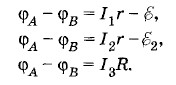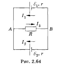 Два элемента, электродвижущие силы которых Решение. Зададим произвольно направление токов (см. рис. 2.64)*. * Если после решения задачи получится отрицательное значение силы тока, то это будет означать, что направление тока выбрано неправильно. Тогда на основании закона Ома для трех участков АВ (А — начало каждого участка, В — его конец) можно записать следующие уравнения: