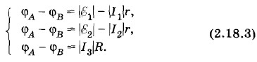 Согласно первому правилу Кирхгофа для узла А имеем: |I1| + |I2| = |I3| Решая систему уравнений (2.18.3), с учетом предыдущего равенства находим искомые значения для модулей сил токов: