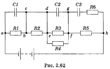 Решение. Из схемы видно, что ток не пойдет через резистор R2 (он закорочен проводником) и R6 (ветвь gh разомкнута конденсатором СЗ, так как постоянный ток через конденсатор не проходит). Поэтому эти резисторы можно исключить. Ток пойдет по цепи abcdeƒh. Эквивалентное внешнее сопротивление