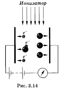 Процесс ионизации газа всегда сопровождается противоположным ему процессом восстановления нейтральных молекул из разноименно заряженных ионов (или из положительных ионов и электронов) вследствие их электрического (кулоновского) притяжения (рис. 3.13). Такой процесс называют рекомбинацией заряженных частиц. Если действие ионизатора неизменно, то в ионизованном газе устанавливается динамическое равновесие, при котором в единицу времени восстанавливается столько же молекул, сколько их распадается на ионы. При этом концентрация заряженных частиц в ионизованном газе сохраняется неизменной. Если же прекратить действие ионизатора, то рекомбинация начнет преобладать над ионизацией и число ионов быстро уменьшится почти до нуля. Следовательно, наличие заряженных частиц в газе — явление временное (пока действует ионизатор). Этим ионизация газа отличается от электролитической диссоциации. В растворе количество диссоциированных молекул остается неизменным сколь угодно долго. Механизм электропроводности газов