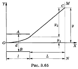 Глава 3. Электрический ток в различных средах § 3.21. Примеры решения задач (окончание)Задача 4Вычислите чувствительность электронно-лучевой трубки к напряжению, т. е. значение отклонения пятна на экране, вызванного разностью потенциалов на управляющих пластинах в 1 В. Длина управляющих пластин l, расстояние между ними d, расстояние от конца пластин до экрана L и ускоряющая разность потенциалов U0. Решение. На рисунке 3.65 схематически изображены управляющие пластины A vs. В трубки, экран MN и траектория электрона ОС. Начало системы координат находится в точке О.