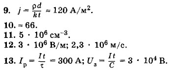 6. ≈ 2,4 г. 7. Определенная концентрация ионов есть результат динамического равновесия: количество ионов, возникающих вследствие электролитической диссоциации, равно убыли числа ионов вследствие обратного процесса — рекомбинации (ионы противоположных знаков, столкнувшись, могут образовать нейтральную молекулу). Вблизи электродов концентрация ионов падает, и это равновесие нарушается. Число ионов, возникших вследствие диссоциации, оказывается больше числа рекомбинированных ионов. Именно этот процесс поставляет ионы в раствор электролита. Процесс происходит вблизи электродов. Внутри раствора электролита динамическое равновесие не нарушается. 8. За секунду к катоду прибывает и на нем выделяется n+υ+S положительных ионов (S — площадь катода). Одновременно удаляется n_υ_S отрицательных ионов. В процессе ухода отрицательных ионов динамическое равновесие между нейтральными молекулами раствора электролита и ионами, на которые они распадаются, нарушается (см. задачу 7). Вновь возникает n_υ_S отрицательных и столько же положительных ионов. Положительные ионы также выделяются на катоде, и в результате заряд, переносимый положительными ионами, выделившимися на катоде в секунду, оказывается численно равным полному току.