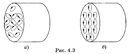 Согласно гипотезе Ампера внутри молекул, слагающих вещество, циркулируют элементарные электрические токи. Если эти токи расположены хаотически по отношению друг к другу, то их действие взаимно компенсируется и никаких магнитных свойств тело не обнаруживает (рис. 4.3, а). В намагниченном состоянии элементарные токи в теле ориентированы строго определенным образом, так что их действия складываются (рис. 4.3, б).