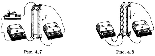 Взаимодействие токовНаблюдать магнитное взаимодействие токов несложно. Надо взять два гибких проводника, укрепить их вертикально и присоединить к источнику тока (рис. 4.4). Заметного притяжения или отталкивания не обнаружится, так как при ЭДС источника в несколько вольт и малой электроемкости проводников заряды проводников слишком малы. Кулоновские силы не проявляются. Но если другие концы проводников соединить так, чтобы в проводниках возникли токи противоположного направления, то проводники начнут отталкиваться, (рис. 4.5). В случае токов одного направления между проводниками возникают силы притяжения (рис. 4.6).