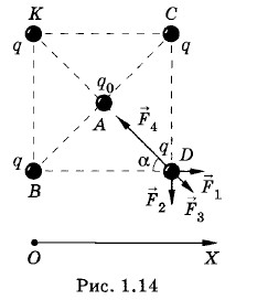 Решение. Искомый заряд q0 должен к притягивать заряды q, расположенные в вершинах квадрата, компенсируя их взаимное отталкивание. Поэтому знаки зарядов q0 и q противоположны. При любом значении заряда q0 он будет находиться в равновесии, так как расположен в центре симметрии квадрата, и силы, действующие на него со стороны зарядов, расположенных в вершинах квадрата, компенсируются. Заряды, расположенные в вершинах квадрата, будут находиться в равновесии, когда суммы действующих на них сил равны нулю. Рассмотрим, например, условие равновесия заряда, расположенного в точке D (рис. 1.14). На этот заряд действуют силы отталкивания