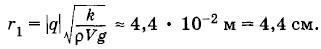 В воздухе на нити висит шарик объемом V = 2 • 10-6 м3 и плотностью ρ = 9 • 103 кг/м3. Заряд шарика q = 2 • 10-7 Кл. На какое расстояние снизу надо поднести к нему маленький шарик с таким же по модулю, но противоположным по знаку зарядом, чтобы сила натяжения нити возросла вдвое? Рассмотрите два случая: а) шарики взаимодействуют в воздухе; б) вся система погружена в керосин (плотность керосина ρк = 800 кг/м3, диэлектрическая проницаемость ε = 2,1). Решение. а) В воздухе на первый шарик до поднесения второго действует сила натяжения нити Так как шарик находится в равновесии, то Т1 = mg. После того как к первому шарику поднесли снизу второй заряженный шарик (рис. 1.10), на первый шарик стали действовать три силы: сила натяжения нити Так как и теперь шарик находится в равновесии, то