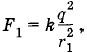 В проекциях на вертикально направленную ось Y это равенство запишется так: Т2 - mg - F1 = 0. Согласно условию T2 = 2T1 = 2mg. Следовательно, 2mg - mg - F1 = 0. Отсюда F1 = mg. По закону Кулона Отсюда