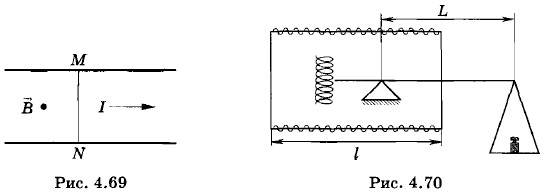 13. Горизонтальные рельсы находятся на расстоянии l друг от друга. Перпендикулярно рельсам лежит стержень, масса которого m. По стержню течет ток I. Коэффициент трения стержня о рельсы μ. При каком минимальном значении индукции магнитного поля 14. Электрон влетает в плоский горизонтальный конденсатор параллельно его пластинам со скоростью υ0 = 2 • 107 м/с. Длина конденсатора l = 10 см, напряженность электрического поля конденсатора Е = 200 В/см. При вылете из конденсатора электрон попадает в магнитное поле, линии индукции которого перпендикулярны силовым линиям электрического поля. Индукция магнитного поля В = 2 • 10-2 Тл. Найдите радиус винтовой траектории электрона в магнитном поле. 15. Электрон движется в однородном магнитном поле с индукцией В = 4 мТл перпендикулярно линиям индукции. Найдите частоту п обращения электрона. Удельный заряд электрона равен 16. В пространстве, где существуют одновременно однородные и постоянные электрическое и магнитное поля, по прямолинейной траектории со скоростью 17. По металлической ленте шириной MN = а течет ток I. Лента помещена в магнитное поле, индукция которого равна В и перпендикулярна ленте (рис. 4.69). Определите разность потенциалов между точками М и N ленты. Площадь поперечного сечения ленты S, а концентрация свободных электронов в ней n. 18. Сила тока в проволочном кольце радиусом В, подвешенном на двух гибких проводниках, равна I. Линии индукции горизонтальны. С какой силой растянуто кольцо, если модуль магнитной индукции равен В? 19. В центре длинного соленоида находится короткая катушка, состоящая из