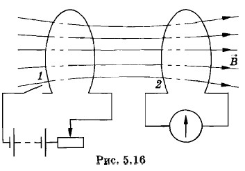 Взаимная индукцияЕще одним частным случаем электромагнитной индукции является взаимная индукция. Взаимной индукцией называют возникновение индукционного тока в замкнутом контуре (катушке) при изменении силы тока в соседнем контуре (катушке). Контуры при этом неподвижны друг относительно друга, как, например, катушки трансформатора. Количественно взаимная индукция характеризуется коэффициентом взаимной индукции, или взаимной индуктивностью. На рисунке 5.16 изображены два контура. При изменении силы тока I1 в контуре 1 в контуре 2 возникает индукционный ток I2. Поток магнитной индукции Ф1,2, созданный током в первом контуре и пронизывающий поверхность, ограниченную вторым контуром, пропорционален силе тока I1: Ф1.2 = L1,2I1 (5.7.3) Коэффициент пропорциональности L1,2 называется взаимной индуктивностью. Он аналогичен индуктивности L.