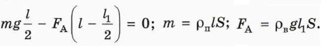 8. Подвешенная за один конец тонкая пластмассовая палочка массой m и длиной l частично погружена в воду и находится в равновесии в наклонном положении (рис. 37.5). При этом длина погружённой в воду части палочки равна l1 Обозначим площадь поперечного сечения палочки S, плотность пластмассы ρп, плотность воды ρв.