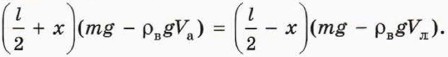 а) Сохранится ли равновесие стержня? И если нет, то какой шар в воде перевесит? б) В сторону какого шара надо передвинуть точку подвеса стержня, чтобы он в воде находился в равновесии? в) Обозначим длину стержня l, массы шаров m, плотности воды, алюминия и латуни ρв, ρа и ρл, а объёмы шаров Vа и Vл. Модуль смещения точки подвеса обозначим х. Объясните, почему справедливо уравнение:
