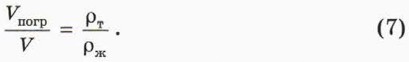 Плавание однородных телМасса m однородного тела связана с его плотностью ρТ и объёмом V соотношением m = ρТV. (5) А сила Архимеда равна весу жидкости в объёме погружённой части тела. Обозначим плотность жидкости ρж, а объём погружённой в жидкость части тела Vnoгp. Тогда FA = ρжgVnoгp. (6)