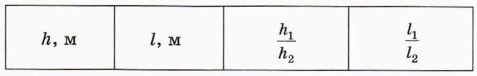 Выберем систему координат, как показано на рисунке. При движении по параболе высота h, с которой падает шарик, и дальность полёта I связаны соотношением Измерив h и l, можно найти скорость шарика в момент отрыва от жёлоба по формуле Ход работы 1. Соберите установку, изображённую на рисунке Л-1. Нижний участок жёлоба должен быть горизонтальным, а расстояние h от нижнего края жёлоба до стола должно равняться 40 см. Лапки зажима расположите около верхнего конца жёлоба. 2. Положите под жёлобом лист бумаги, придавив его книгой, чтобы он не сдвигался при проведении опытов. Отметьте на этом листе с помощью отвеса точку А, находящуюся на одной вертикали с нижним концом жёлоба. 3. Поместите шарик в жёлоб так, чтобы он касался зажима штатива, и отпустите шарик без толчка. Заметьте (примерно) место на столе, куда упадёт шарик. На отмеченное место положите лист бумаги, а на него — лист копировальной бумаги рабочей стороной вниз. Придавите эти листы книгой, чтобы они не сдвигались при проведении опытов. 4. Снова поместите шарик в жёлоб так, чтобы он касался зажима штатива, и отпустите без толчка. Повторите этот опыт 5 раз, следя за тем, чтобы лист копировальной бумаги и находящийся под ним лист не сдвигались. Снимите лист копировальной бумаги, не сдвигая листа под ним, и отметьте точку, расположенную наиболее близко ко всем отпечаткам (выбор этой точки означает усреднение результатов пяти опытов). Учтите при этом, что некоторые отпечатки могут быть расположены очень близко друг к другу. 5. Измерьте расстояние l от отмеченной точки до точки А. 6. Опустите жёлоб так, чтобы его нижний край находился на высоте 10 см над столом, и повторите пункты 1—5. Измерьте соответствующее значение дальности полёта и вычислите отношения 7. Результаты измерений и вычислений запишите в таблицу, заголовок которой приведён ниже.