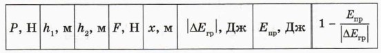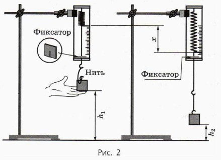 2. Привяжите груз на нити длиной 12—15 см к крючку динамометра. Закрепите динамометр в зажиме штатива на такой высоте, чтобы груз при максимальном растяжении пружины динамометра не доставал до стола. 3. Приподняв груз так, чтобы нить провисала, установите фиксатор на стержне динамометра около ограничительной скобы (рис. 3, а). Отпустив груз, убедитесь в том, что при максимальном растяжении пружины она не достаёт до ограничительной скобы (в противном случае при неупругом ударе пружины об ограничительную скобу произойдёт превращение значительной части её механической энергии во внутреннюю). Если это условие не выполняется, уменьшите начальную высоту груза. 4. Поднимите груз и измерьте высоту h1, на которой находится нижняя грань груза. 5. Отпустите груз без толчка. Падая, груз растянет пружину, и фиксатор переместится по стержню вверх. Затем, растянув рукой пружину так, чтобы фиксатор оказался у ограничительной скобы, измерьте F, х и h2. 6. Вычислите: а) вес груза Р = mg; б) увеличение потенциальной энергии пружины 7. Результаты измерений и вычислений запишите в таблицу, заголовок которой приведён ниже.