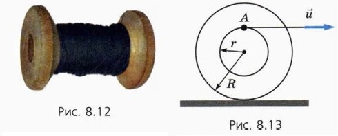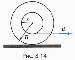 17. Катушка с ниткой (рис. 8.12) может катиться по горизонтальному столу без проскальзывания. Конец нити тянут в горизонтальном направлении со скоростью, равной по модулю u (рис. 8.13). Внутренний радиус катушки r, а внешний R. Докажите, что катушка будет двигаться вправо со скоростью