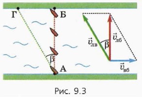 Рассмотрим теперь, как надо направить скорость лодки относительно воды, чтобы лодка попала в точку Б, расположенную точно напротив начальной точки А (рис. 9.3).