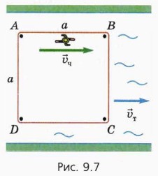 § 9. Сложение скоростей и переход в другую систему отсчёта при движении на плоскости Дополнительные вопросы и задания к § 9: Сложение скоростей и переход в другую систему отсчёта при движении на плоскости7. По реке плывёт квадратный плот со стороной а (рис. 9.7). По периметру плота идёт человек со скоростью υч относительно плота. Скорость течения равна υт.