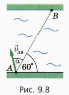 а) Найдите выражение для пути, пройденного человеком относительно берега, если он двигался от А к В; от В к С; от С к В; от В к А. б) Найдите отношение пути, пройденного человеком относительно берега, к пути, пройденному им относительно плота, если: 1) υч = 2υт; 2) υч = 0,5υт. 8. Человек на моторной лодке отправляется из точки А с намерением попасть в точку В (рис. 9.8).
