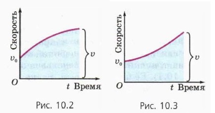 2. На рисунках 10.2 и 10.3 изображены графики зависимости скорости от времени для двух тел. В каком случае средняя скорость меньше среднего арифметического начальной и конечной скорости, а в каком — больше?