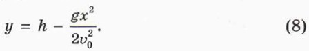 П о д с к а з к а. Используя формулу (4), выразите t через х и подставьте найденное выражение в формулу (5). Формула (8) действительно представляет собой уравнение параболы. Её вершина совпадает с начальным положением тела, то есть имеет координаты х = 0; у = h, а ветвь параболы направлена вниз (на это указывает отрицательный коэффициент перед х2).
