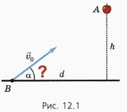 § 12. Относительное движение брошенных тел. Отскок от наклонной плоскости Относительное движение брошенных телПусть в некоторый момент (t = 0) из точки А на высоте h начинает падать яблоко (рис. 12.1). Лежащий на траве юный стрелок в тот же момент стреляет из пружинного пистолета, намереваясь попасть «в яблочко». Пистолет находится в точке В на расстоянии d от вертикали, вдоль которой падает яблоко, а скорость пули по модулю равна υ0.