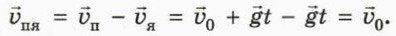 Здесь П о д с к а з к а. Воспользуйтесь тем, что Формула (2) тоже замечательна своей простотой: как будто бы яблоко и правда замерло на месте в ожидании пули, а пуля летела к яблоку, не чувствуя земного притяжения! Найдём теперь физическую разгадку этой «простоты» и покажем, как можно было найти угол а и время полёта устно. Поскольку яблоко и пуля движутся с ускорением свободного падения