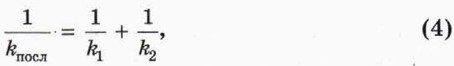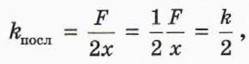 Возьмём теперь вторую такую же пружину и соединим пружины, как показано на рисунке 15.6, в. В таком случае говорят, что пружины соединены последовательно. Найдём жёсткость kпосл системы из двух последовательно соединённых пружин. Если растягивать систему пружин силой Следовательно,