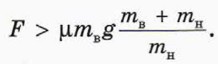 К верхнему бруску прикладывают горизонтально направленную вправо силу Самое главное в таких задачах — увидеть две возможности: 1) бруски могут начать двигаться друг относительно друга — тогда между ними будут действовать силы трения скольжения; 2) бруски могут начать двигаться как единое целое — тогда между ними будут действовать силы трения покоя; Начнём с первой возможности: в таком случае модуль силы трения скольжения, действующей на каждое тело, равен μmBg. Модуль же силы трения покоя заранее неизвестен.