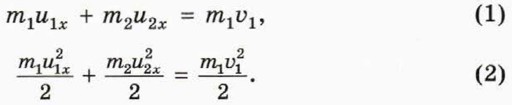 П о д с к а з к а. До и после столкновения тела движутся вдоль оси х, поэтому квадраты скоростей равны квадратам проекций скоростей: Переход к системе двух линейных уравненийПерепишем уравнения (1) и (2) так, чтобы величины, относящиеся ко второму шару, находились слева от знака равенства, а к первому шару — справа. Кроме того, сократим общий множитель