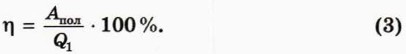 § 43. Тепловые двигатели. Второй закон термодинамики Коэффициент полезного действия (КПД) теплового двигателяЭффективность теплового двигателя определяется отношением полезной работы двигателя к количеству теплоты, полученному от нагревателя. Коэффициентом полезного действия η теплового двигателя называют выраженное в процентах отношение полезной работы Апол, совершённой двигателем, к количеству теплоты Q1, полученной от нагревателя: