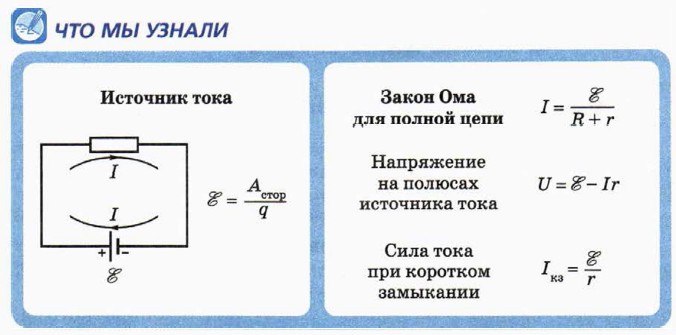 § 59. Закон Ома для полной цепи КПД источника токаРаботу тока во внешней цепи называют полезной работой. Обозначим её Апол. Используя формулу для работы тока, получаем: Апол = I2Rt. Поскольку источник обладает внутренним сопротивлением, полезная работа меньше работы сторонних сил, потому что часть работы сторонних сил расходуется на выделение в источнике тока количества теплоты I2rt. Поскольку Астор = I2Rt + I2rt, получаем для отношения полезной работы к работе сторонних сил: