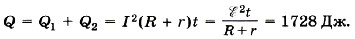 Глава 15. Законы постоянного тока § 107. Примеры решения задач по теме «Работа и мощность постоянного тока. Закон Ома для полной цепи»При решении задач, связанных с расчётом работы и мощности тока, надо применять формулы (15.13) и (15.15). Для определения силы тока в замкнутой цепи надо использовать закон Ома для полной цепи, а в случае нескольких источников правильно определить суммарную ЭДС. Задача 1. Аккумулятор с ЭДС Ε = 6,0 В и внутренним сопротивлением r — 0,1 Ом питает внешнюю цепь с сопротивлением R = 12,4 Ом. Какое количество теплоты Q выделится во всей цепи за время t = 10 мин? Р е ш е н и е. Согласно закону Ома для замкнутой цепи сила тока в цепи равна