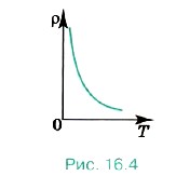 Отличие проводников от полупроводников особенно проявляется при анализе зависимости их электропроводимости от температуры. Исследования показывают, что у ряда элементов (кремний, германий, селен, индий, мышьяк и др.) и соединений (PbS, CdS, GaAs и др.) удельное сопротивление с увеличением температуры не растёт, как у металлов (см. рис. 16.3), а, наоборот, чрезвычайно резко уменьшается (рис. 16.4). Такое свойство присуще именно полупроводникам.