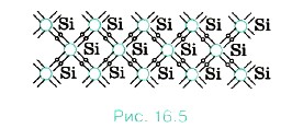 Из графика, изображённого на рисунке, видно, что при температурах, близких к абсолютному нулю, удельное сопротивление полупроводников очень велико. Это означает, что при низких температурах полупроводник ведёт себя как диэлектрик. По мере повышения температуры его удельное сопротивление быстро уменьшается. Строение полупроводниковДля того чтобы включить транзисторный приёмник, знать ничего не надо. Но чтобы его создать, надо было знать очень много и обладать незаурядным талантом. Понять же в общих чертах, как работает транзистор, не так уж и трудно. Сначала необходимо познакомиться с механизмом проводимости в полупроводниках. А для этого придётся вникнуть в природу связей, удерживающих атомы полупроводникового кристалла друг возле друга. Для примера рассмотрим кристалл кремния. Кремний — четырёхвалентный элемент. Это означает, что во внешней оболочке его атома имеется четыре электрона, сравнительно слабо связанные с ядром. Число ближайших соседей каждого атома кремния также равно четырём. Схема структуры кристалла кремния изображена на рисунке (16.5).
