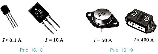 Компьютеры, составленные из микросхем и микропроцессоров, фактически изменили окружающий человека мир. В настоящее время не существует ни одной области человеческой деятельности, где компьютеры не служили бы активными помощниками человека. Например, в космических исследованиях или высокотехнологичных производствах работают микропроцессоры, уровень организации которых соответствует искусственному интеллекту. Транзисторы (рис. 16.18, 16.19) получили чрезвычайно широкое распространение в современной технике. Они заменили электронные лампы в электрических цепях научной, промышленной и бытовой аппаратуры. Портативные радиоприёмники, в которых используются такие приборы, в обиходе называются транзисторами. Преимуществом транзисторов (так же как и полупроводниковых диодов) по сравнению с электронными лампами является прежде всего отсутствие накалённого катода, потребляющего значительную мощность и требующего времени для его разогрева. Кроме того, эти приборы в десягки и сотни раз меньше по размерам и массе, чем электронные лампы.