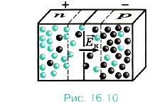 Глава 16. Электрический ток в различных средах § 111. Электрический ток через контакт полупроводников с разным типом проводимости. ТранзисторыКакие носители тока в полупроводнике являются основными, а какие — неосновными? Чем отличается примесная проводимость от собственной проводимости? Наиболее интересные явления происходят при контакте полупроводников n- и p-типов. Эти явления используются в большинстве полупроводниковых приборов. р—n-ПереходРассмотрим, что будет происходить, если привести в контакт два одинаковых полупроводника, но с разным типом проводимости: слева полупроводник n-типа, а справа полупроводник р-типа (рис. 16.10).