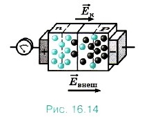 Суммарное сопротивление приведённых в контакт полупроводников складывается из сопротивления полупроводника л-типа, р—n-перехода и полупроводника p-типа: R = Rn + Rpn + Rр. Так как сопротивления областей с n- и p-типами проводимости малы (там много носителей заряда — электронов и дырок), то суммарное сопротивление определяется в основном сопротивлением р—n-перехода: R ≈ Rpn. Включим полупроводник с р—n-переходом в электрическую цепь так, чтобы потенциал полупроводника p-типа был положительным, а n-типа — отрицательным (рис. 16.11). В этом случае напряжённость внешнего поля будет направлена в сторону, противоположную напряжённости контактного слоя.
