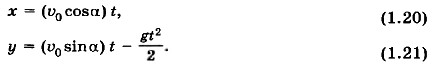 Так как в начальный момент времени тело находилось в начале координат, то x0 = 0 и у0 = 0. Проекцию вектора на какую-либо ось можно выразить через модуль вектора и косинус или синус угла, который этот вектор образует с положительным направлением оси. Из рисунка 1.51 видно, что υ0x = υ0cosα, υ0y = υ0sinα, ax = 0 и ay = -g. Поэтому уравнения (1.18) и (1.19) можно записать в виде