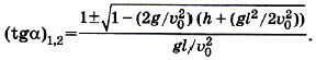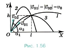 Решив его, найдём Тогда значения угла Оба значения имеют смысл. Кроме этого, если (g/υ20)(h + gl2/2υ20) = = 1/2, то мяч касается планки в наивысшей точки траектории. На рисунке 1.56 показаны три возможные траектории полёта мяча.