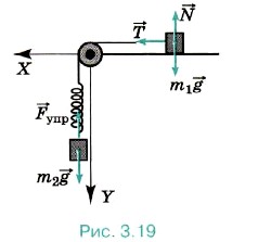 Подставив в формулу (2) выражения для удлинений x1 и х2 пружин, получим Для эффективной жёсткости получим выражение Задача 4. Через блок, закреплённый у края стола, перекинута нерастяжимая нить, к концам которой привязаны брусок массой m1 = 1 кг, находящийся на горизонтальной поверхности стола, и пружина жёсткостью k = 50 Н/м, расположенная вертикально. Ко второму концу пружины привязана гиря массой m2 = 200 г (рис. 3.19). Определите удлинение пружины при движении тел. Силу трения, массы пружины, блока и нити не учитывайте.