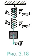 Глава 3. Силы в механике Примеры решения задач по теме: Силы упругости. Закон ГукаЗадача 3. К потолку подвешены последовательно две невесомые пружины жёсткостями 60 Н/м и 40 Н/м. К нижнему концу второй пружины прикреплён груз массой 0,1 кг. Определите жёсткость воображаемой пружины, удлинение которой было бы таким же, как и двух пружин при подвешивании к ней такого же груза (эффективную жёсткость). Р е ш е н и е. Так как весом пружин можно пренебречь, то очевидно, что силы натяжения пружин равны (рис. 3.18). Тогда согласно закону Гука Fynp1 = Fупр2; k1x1 = k2х2. (1)