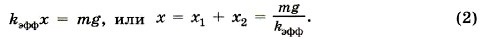 На подвешенный груз действуют две силы — сила тяжести и сила натяжения второй пружины. Условие равновесия груза запишем в виде mg = k2х2. Из этого уравнения найдём удлинение Подставив выражение для х2 в уравнение (1), получим для удлинения Определим теперь эффективную жёсткость. Запишем закон Гука для воображаемой пружины: