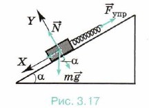 Задача 2. Определите, как изменяется сила натяжения пружины, прикреплённой к бруску массой m = 5 кг, находящемуся неподвижно на наклонной поверхности, при изменении угла наклона от 30° до 60°. Трение не учитывайте. Р е ш е н и е. На брусок действуют сила тяжести, сила натяжения пружины и сила реакции опоры (рис. 3.17).