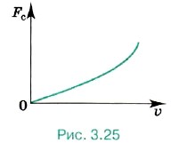 Это приводит к тому, что усилием рук можно сдвинуть тяжёлое тело, например плавающую лодку, в то время как сдвинуть с места, скажем, поезд усилием рук просто невозможно. Модуль силы сопротивления Fc зависит от размеров, формы и состояния поверхности тела, свойств среды (жидкости или газа), в которой тело движется, и, наконец, от относительной скорости движения тела и среды. Примерный характер зависимости модуля силы сопротивления от модуля относительной скорости тела показан на рисунке 3.25. При относительной скорости, равной нулю, сила сопротивления не действует на тело (Fc = 0). С увеличением относительной скорости сила сопротивления сначала растёт медленно, а затем всё быстрее и быстрее. При малых скоростях движения силу сопротивления можно считать прямо пропорциональной скорости движения тела относительно среды: