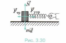 Из уравнения (3) получим N = mg - Fн sinα. Подставив в уравнение (2) выражение для силы трения Fтp = μx(mg - Fн sinα), получим Fн cosα - μx(mg - Fн sinα) = 0. Для силы натяжения имеем Сила натяжения минимальна при максимальном значении суммы cosα + μsinα = ƒ(α). Исследуем функцию на экстремум: ƒ' = -sinα + μcosα = 0. Получим tgα = μ. Тогда Выразим cosa через tgα: Окончательно для силы натяжения получим Задача 5. Брусок массой 5 кг тянут по поверхности стола, взявшись за кольцо динамометра. При этом ускорение тела равно 0,5 м/с2. Жёсткость пружины равна 200 Н/м Определите растяжение пружины. Коэффициент трения бруска о стол 0,05. Р е ш е н и е. На брусок действуют сила тяжести m