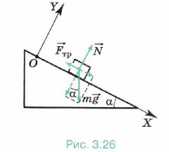 Глава 3. Силы в механике § 37. Примеры решения задач по теме «Силы трения»При решении задач о движении тел, на которые действует сила трения, надо всегда иметь в виду, что сила трения скольжения, действующая на тело, направлена в сторону, противоположную относительной скорости движения. Поэтому, чтобы нарисовать вектор силы трения, прежде всего надо определить направление движения тела. Задача 1. В результате полученного толчка кирпич начал скользить вниз по неподвижной ленте конвейера, расположенной под углом α = 30° к горизонтальной плоскости. Определите модуль и направление ускорения кирпича, если коэффициент трения скольжения кирпича о ленту конвейера μ = 0,6. Р е ш е н и е. Направим ось ОХ вдоль наклонной ленты конвейера вниз, а ось OY перпендикулярно ленте конвейера вверх (рис. 3.26). Так как кирпич движется вдоль оси ОХ, то его ускорение может быть направлено только вдоль этой оси вниз либо вверх. По второму закону Ньютона m
